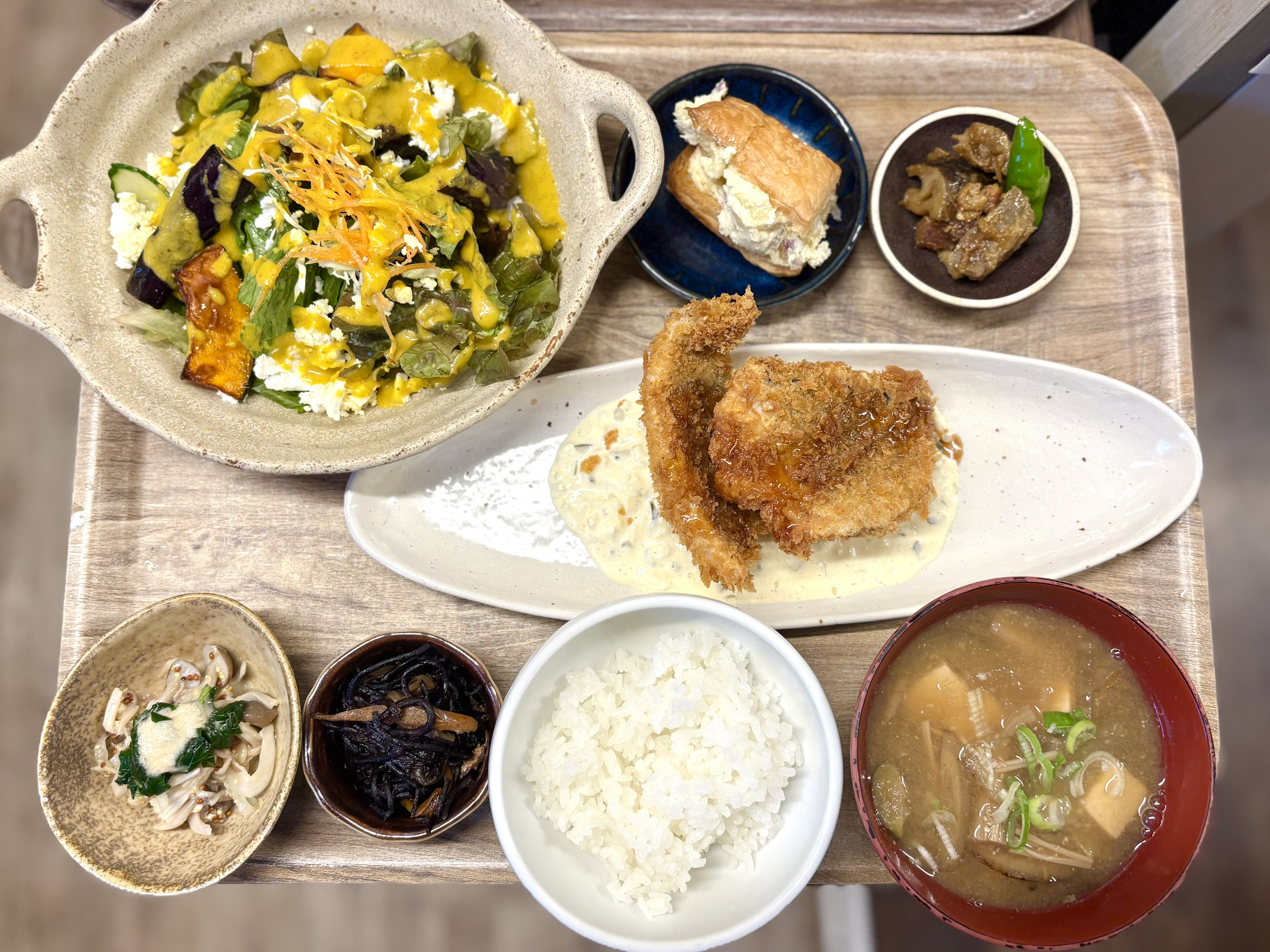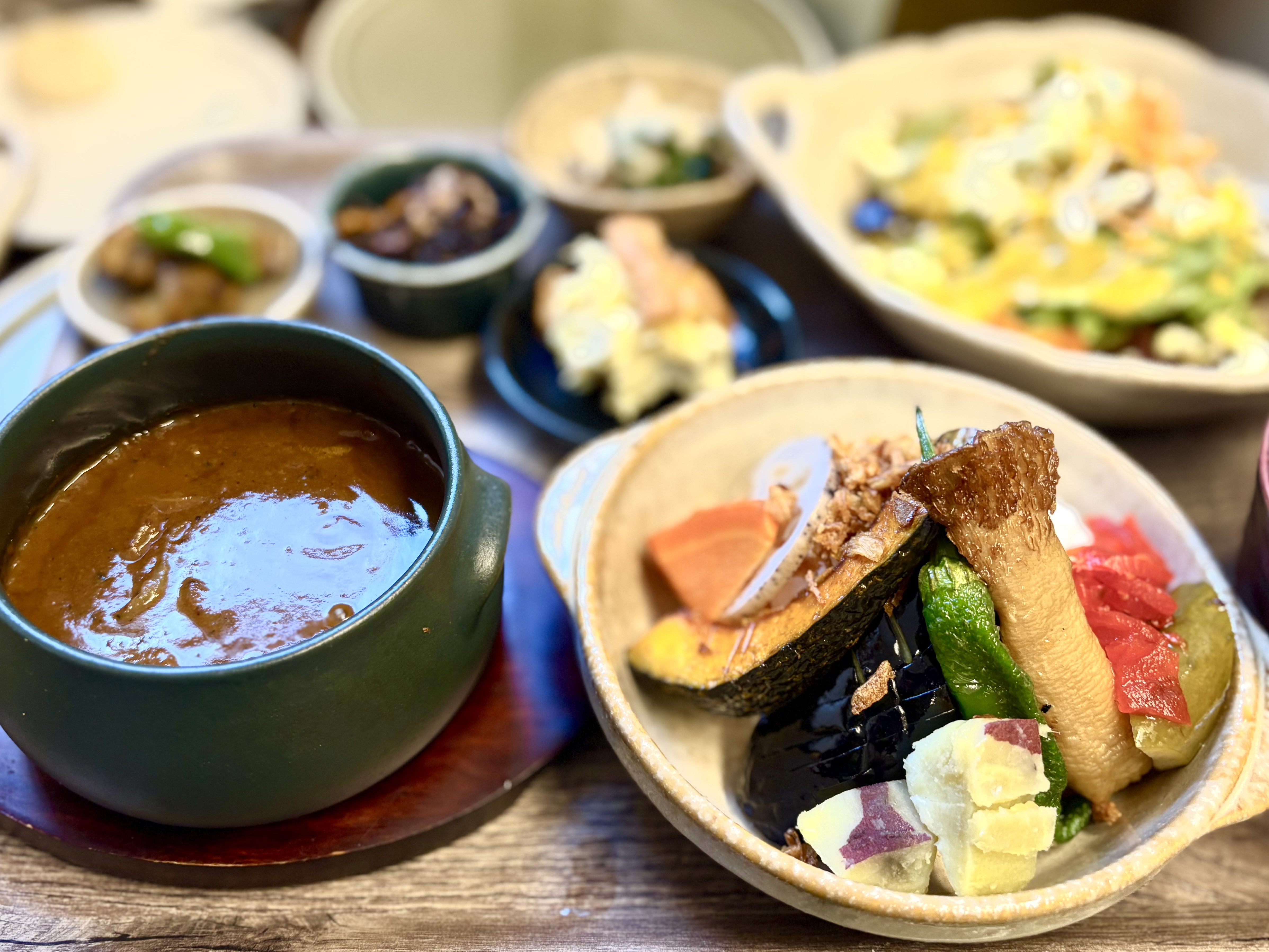 ①サラダプレート(②フレッシュサラダ③きのこのマスタードサラダ④さつまいもとクリームチーズのサラダ)